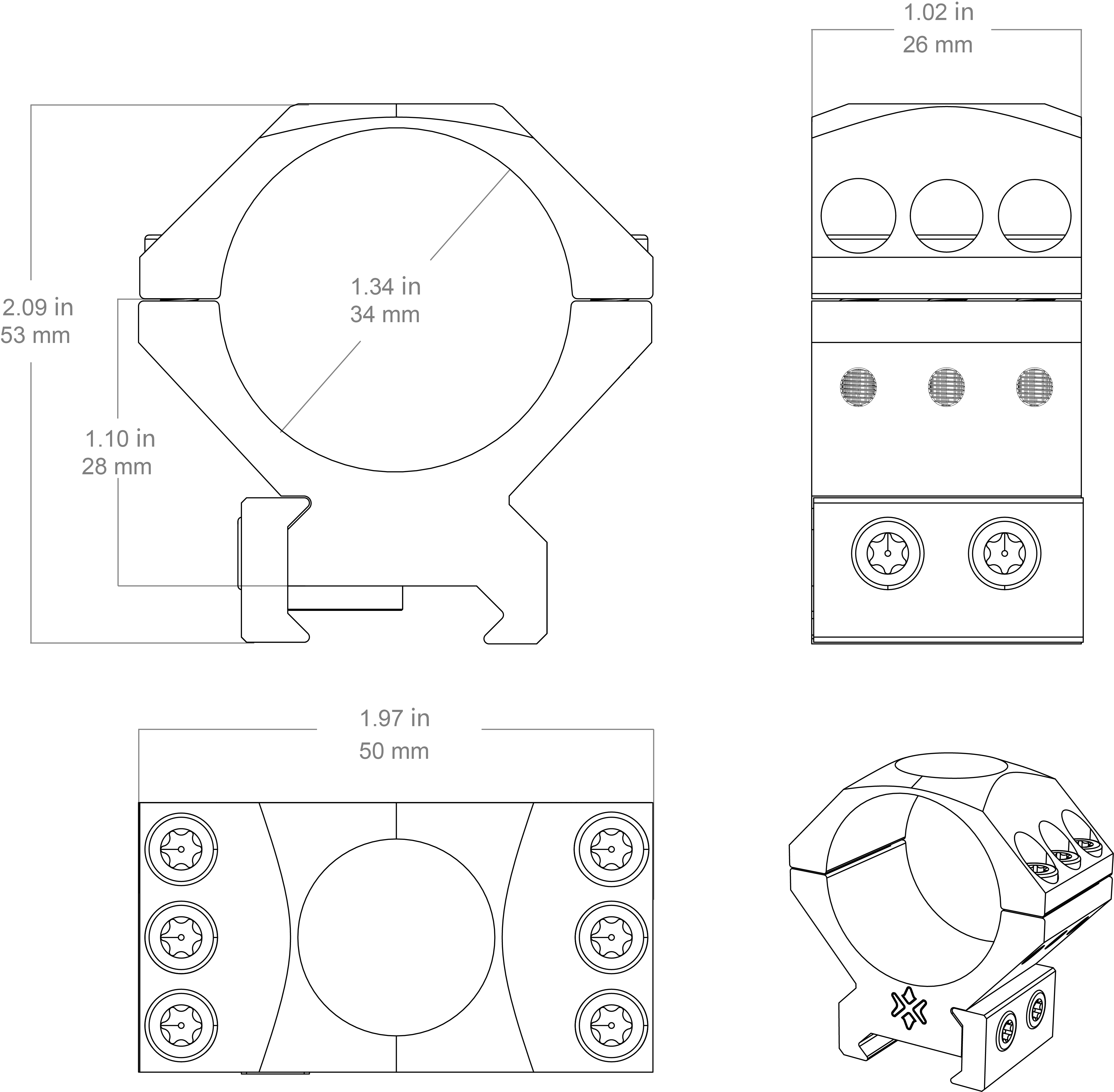 Include articole: inele înalte Picatinny de 34 mm (implicit), parasolar, instrucțiuni, capace de obiectiv și cârpă de curățare